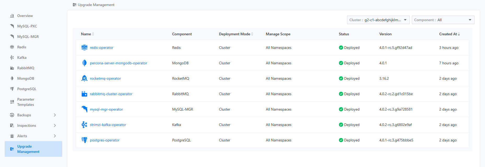 Users can view the currently deployed Operator list in the instance upgrade control center. The list displays key information such as deployment mode, Operator management scope, Operator status, and Operator version. It is important to note that after switching the current project, the cluster selector in the upper right corner will also reset, requiring the user to reselect the cluster for the Operator list to display correctly. This design is due to the multi-tenant model, where a project can contain multiple different clusters.